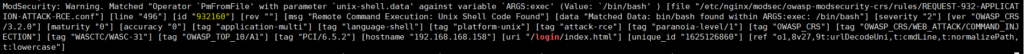 ModSecurity: Warning. Matched "Operator `PmFromFile' with parameter `unix-shell.data' against variable `ARGS:exec' (Value: `/bin/bash' ) [file "/etc/nginx/modsec/owasp-modsecurity-crs/rules/REQUEST-932-APPLICATION-ATTACK-RCE.conf"] [line "496"] [id "932160"] [rev ""] [msg "Remote Command Execution: Unix Shell Code Found"] [data "Matched Data: bin/bash found within ARGS:exec: /bin/bash"] [severity "2"] [ver "OWASP_CRS/3.2.0"] [maturity "0"] [accuracy "0"] [tag "application-multi"] [tag "language-shell"] [tag "platform-unix"] [tag "attack-rce"] [tag "paranoia-level/1"] [tag "OWASP_CRS"] [tag "OWASP_CRS/WEB_ATTACK/COMMAND_INJECTION"] [tag "WASCTC/WASC-31"] [tag "OWASP_TOP_10/A1"] [tag "PCI/6.5.2"] [hostname "192.168.168.158"] [uri "/login/index.html"] [unique_id "1625126860"] [ref "o1,8v27,9t:urlDecodeUni,t:cmdLine,t:normalizePath,t:lowercase"]